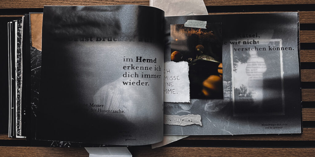Diese Erfahrung ist der Ausgangspunkt meiner Bachelorarbeit „Ich erinnere dich zu Tode“. Sie ist eine experimentelle, printmediale Auseinandersetzung mit Alzheimer/Demenz und der Frage, was bleibt, wenn Erinnerungen zerfällt. Ich erzähle die Geschichte meines Opas, den Verlauf seiner Erkrankung und den Verlust, der damit für ihn, aber auch für mich und meine Familie einherging.