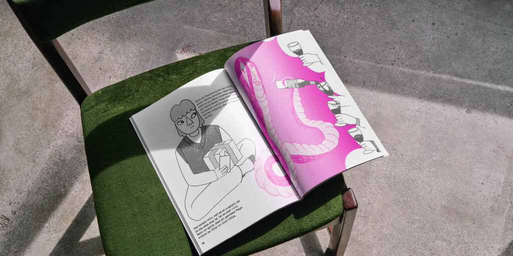Meine Bachelorarbeit „Sehnsucht“ beschäftigt sich mit dem Thema Sucht und den Geschichten von Menschen, die selbst Betroffene oder Angehörige sind. Durch Interviews und Gespräche habe ich ihre Erfahrungen gesammelt und sechs Stories aufgebaut. Entstanden ist ein Buch, mit Texten und begleitenden Illustrationen, welches selbst gebunden und mit dem Risographen gedruckt wurde. Mir war es wichtig, diese Erzählungen zu visualisieren, um dem Thema mehr Raum verleihen zu können. Das Buch soll dazu einladen, sich mit den Geschichten der Menschen zu beschäftigen und Einblicke zu gewinnen.