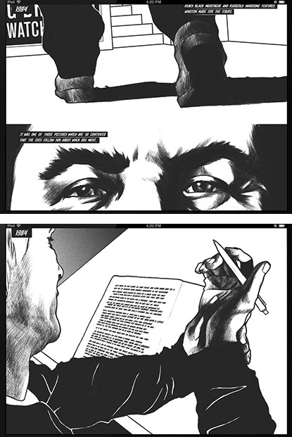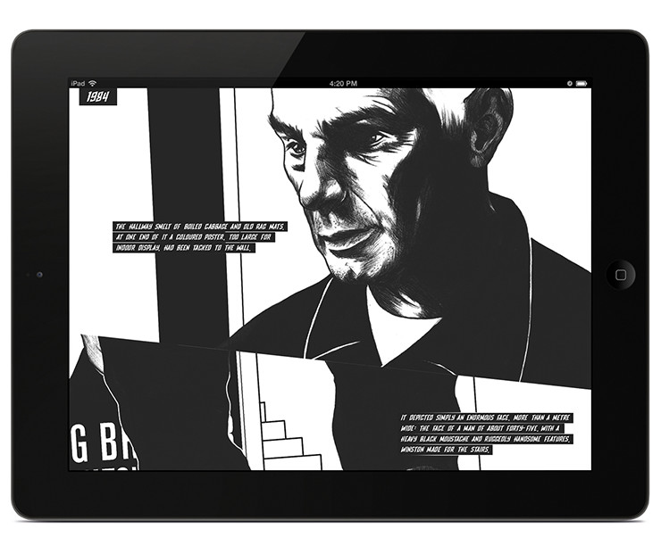 Graphic Novels gehören mittlerweile in jede gut sortierte Buchhandlung und sind längst nicht mehr nur verpickelten Nerds vorenthalten. Umso mehr überrascht es, dass das Medium im digitalen Bereich noch nicht wirklich Fuß gefasst zu haben scheint. Besonders Smartphones und Tablets haben unsere Art mit digitalen Inhalten umzugehen revolutioniert. Deshalb habe ich neue Wege gesucht und zum Buch „1984“ von George Orwell eine tabletgerechte Graphic Novel konzipiert.