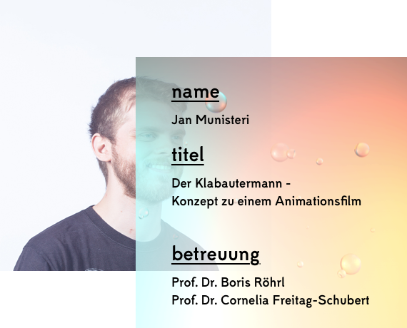 Meine Thesis stellt ein Konzeptbuch zu einem 2D-Animationsfilm dar, welcher sich über die Geschichte des Klabautermannes dreht. Dort werden sowohl Charaktere, als auch Kostüme und Locations entworfen, sowie einige Szenenbilder. In der Story spielen ein Fischer names Jan Classen und seine Frau Helge die Hauptrolle, deren Fischerhütte in der Nähe des Gewässers liegt, in dem der Klabautermann lebt. Der Klabautermann rettet eines Tages den Fischer, als dieser in Seenot gerät.