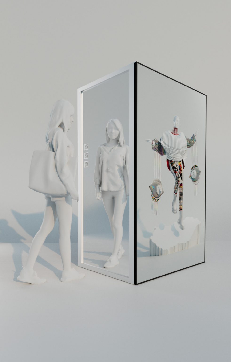 Die Ausstellung besteht aus einem Hochkantscreen (ca. 180cm oder 200cm hoch) und einem 2m großen Spiegel das direkt daneben steht. Auf dem Screen werden Animationen gezeigt während man im Spiegel die Outfits selbst druch AR „anziehen“ und ausprobieren kann.