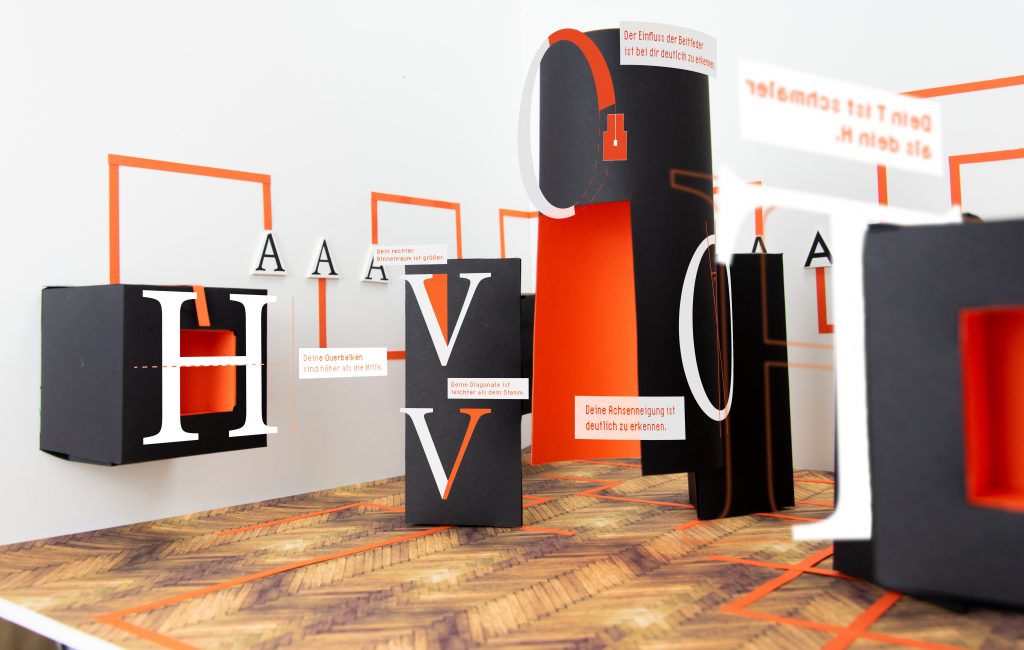 In einem räumlichen Persönlichkeitstest erkundet der User nacheinander Klänge, Texturen und Düfte und wird basierend auf seiner Auswahl an einem Liniensystem von einer Station zur nächsten geführt, bis er schließlich zu seinem persönlichen Ergebnis gelangt: Welche Schriftklassifikation bin ich? Dieses Ergebnis wird mit dem Smartphone gescannt, wodurch sich eine Augmented-Reality-Ausstellung öffnet, die dem User unsichtbare Details aus seiner persönlichen Schriftklassfikation näherbringt.