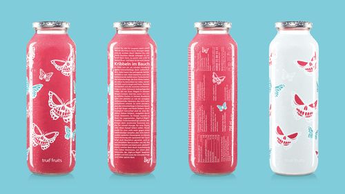 Meine Thesis ist ein Flaschendesign für die Firma True Fruits. Ich habe eine Limited Edition Smoothie-Flasche zum Thema „Schmetterlinge im Bauch“ erstellt. Teil des Projekts ist eine Illustration auf der Flasche sowie ein Flaschentext. Zusätzlich erstellte ich Postings für Social Media, um die Flasche zu kommunizieren. Teil der Postings sind Wordings, die das Thema auf eine lockere, humorvolle Art rüberbringen. Bei meinem Thema „Schmetterlinge im Bauch“ gehe ich darauf ein, dass dieses Gefühl nicht nur beim Verliebtsein auftritt, sondern auch wenn Angst im Spiel ist. Ich möchte damit das Thema Angst auf die Tagesordnung rufen und zeigen, dass Angst kein Tabu-Thema ist.